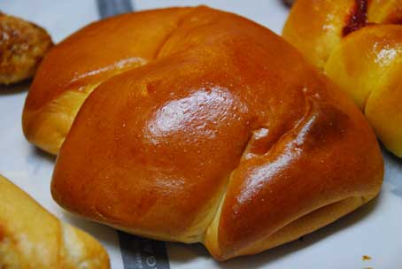 手前から、あんぱん、めんたいフランス、クリームパンとクロワッサン