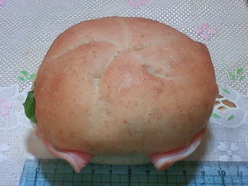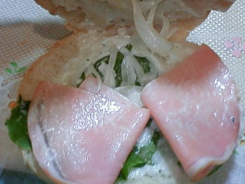 「カイザーセンメル」というドイツパンにレタス、玉ねぎ、ハムがはさんであります。