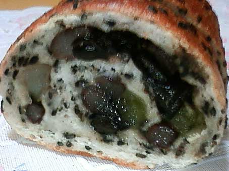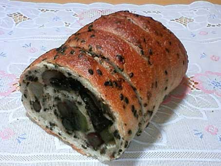 黒ごまを練り込んだフランスパン生地にうぐいす豆や小豆などの甘納豆が入ってます。