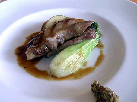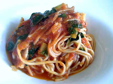 黒胡椒でソテーした豚バラ肉とフダン草のトマトソース