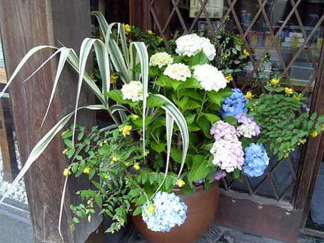玄関先の大きな瓶に季節を感じさせる花が活けてありました。