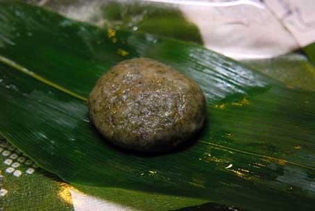 生麩に青海苔を練りこみ、こし餡が包み込んであります。