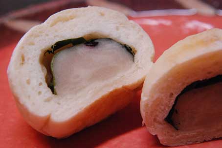 パンの中の白餡を大葉で包んで、ほんのちょっと塩味の効いた梅が入っています。