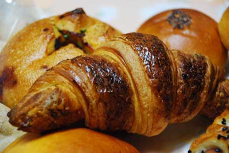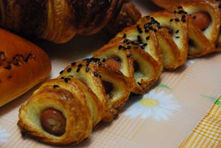 クロワッサンに、ソーセージにデニッシュ生地を網のように巻いたパンと
