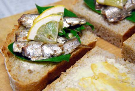 オイルサーディンを缶ごと焼いてからパンに乗せます。