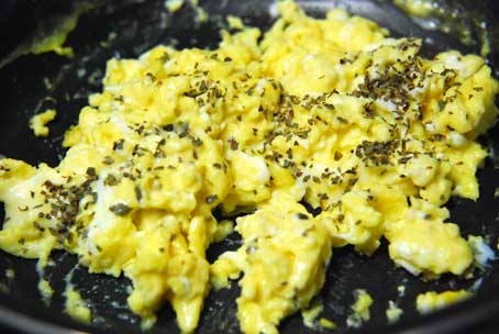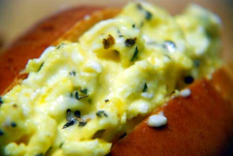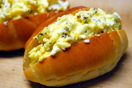 パンに切れ目を入れてバターを塗り、スクランブルエッグをはさみます。