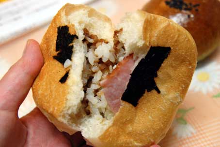 割ってみると、中に焼きおにぎりとスライスハムが入っていました。