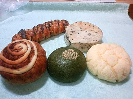 前列左から、「ショコラなんとか(笑)」・「よもぎあんぱん」・「クリームメロンパン」