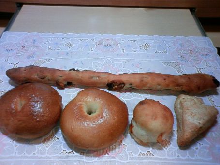 前列左から、「ワイルドブルーベリーべーグル」、「プレーンべーグル」、「プチチーズパン」、「おからスコーン」