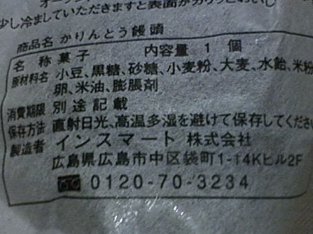 「かりんとう饅頭」の裏面、製造者はインスマートとなっています。