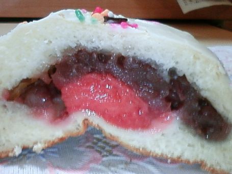 いちごとあんが入っていて、表面はホワイトチョコレートでコーティングされています。