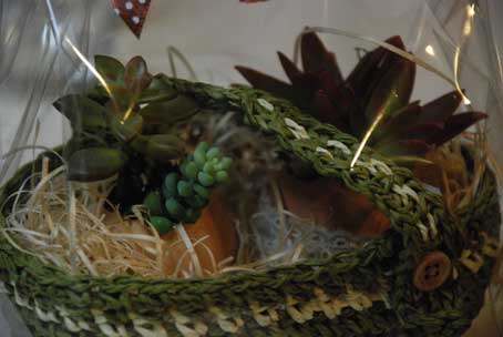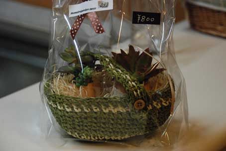 くんちゃんたまごの殻に植えられていて、編んだカゴに詰められています。