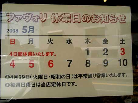 ゴールデンウィーク中のファヴォリの休業日は ↓ こちらです。