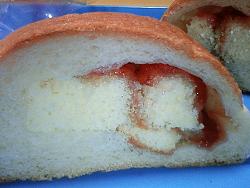 名前の由来はなんじゃらほい? 中はイチゴジャムとカステラです。